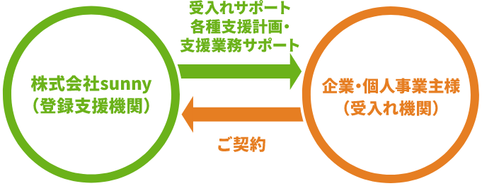 株式会社 sunnyでは、人手不足に悩む企業や個人事業主の皆様の解決になるよう、登録支援機関として、在留資格「特定技能」の外国人材の方の受入れをサポート致します。