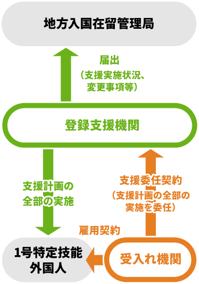 外国人材を受け入れる企業様は、「特定技能1号」の資格を取得した外国人(特定技能外国人)の受入れに際する支援計画の一部、またはその全部の実施を登録支援機関に委託することができます。